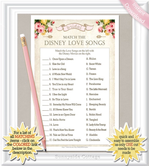 Match The Disney Love Songs Bridal Game With Vintage Roses Etsy