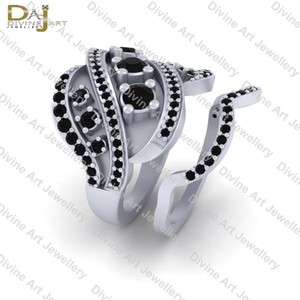 Black Diamond 3 Stone Engagement Ring Band Set Matching 2pc Bridal