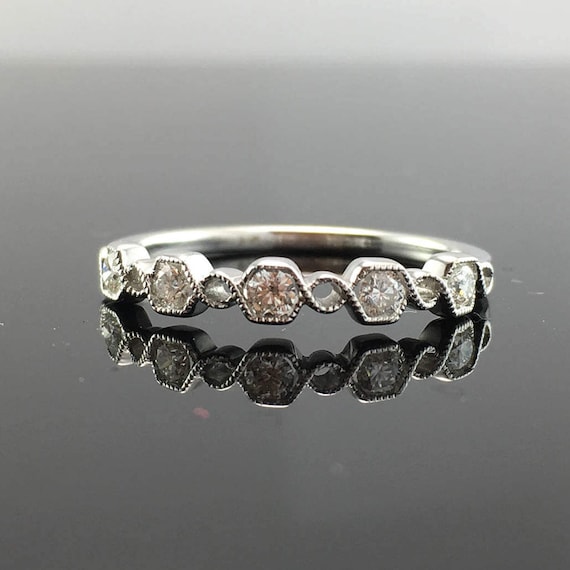 14k White Gold Milgrain Geometric Diamond Wedding Band White Etsy
