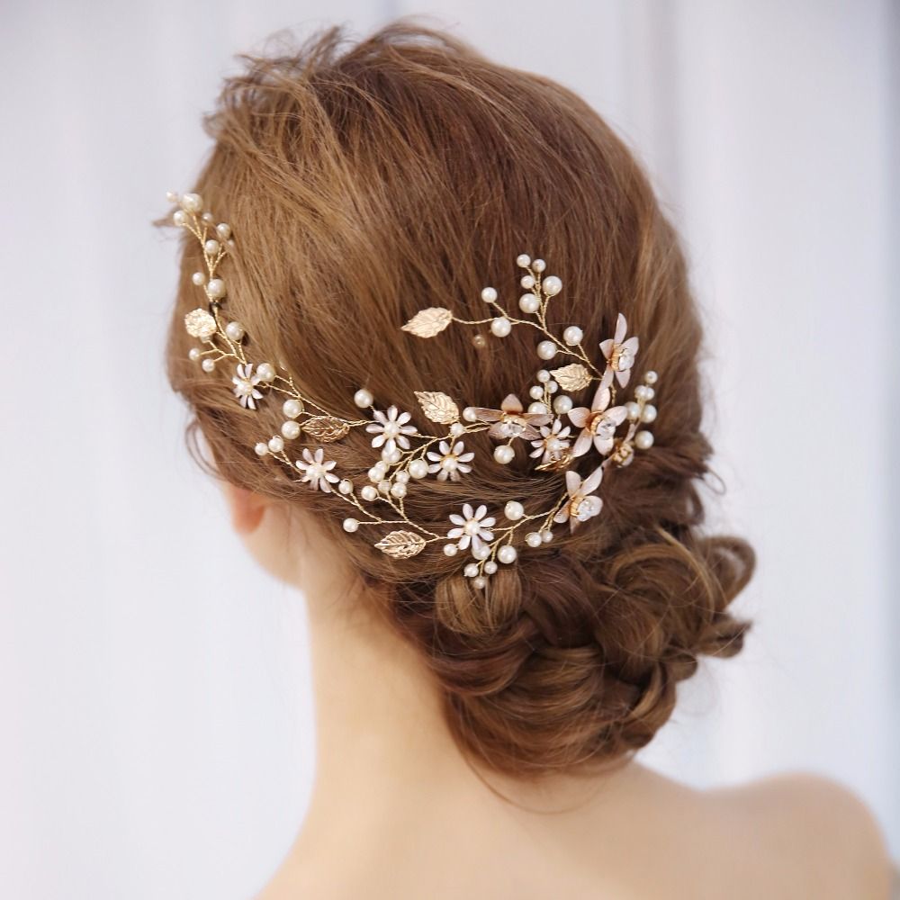 Gold Color Freshwater Pearl With Metal Flower Wedding Hair Bands
