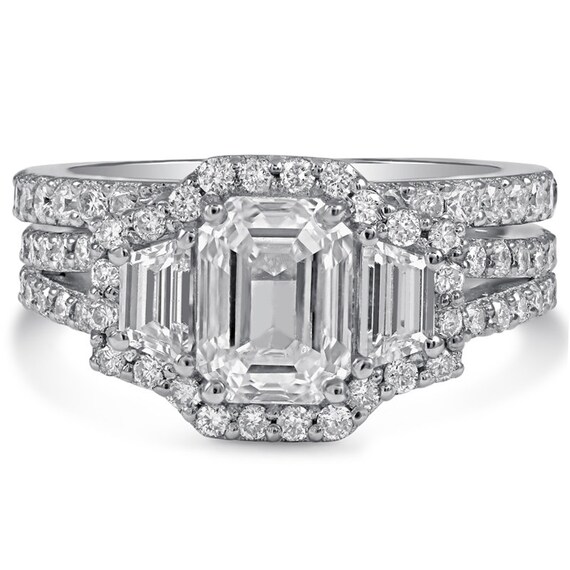 Engagement Ring Trio Band Emerald Cut Diamond Engagement Ring