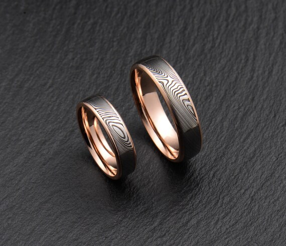 Stainless Damascus Steel And Rose Gold Wedding Band Engagement Etsy
