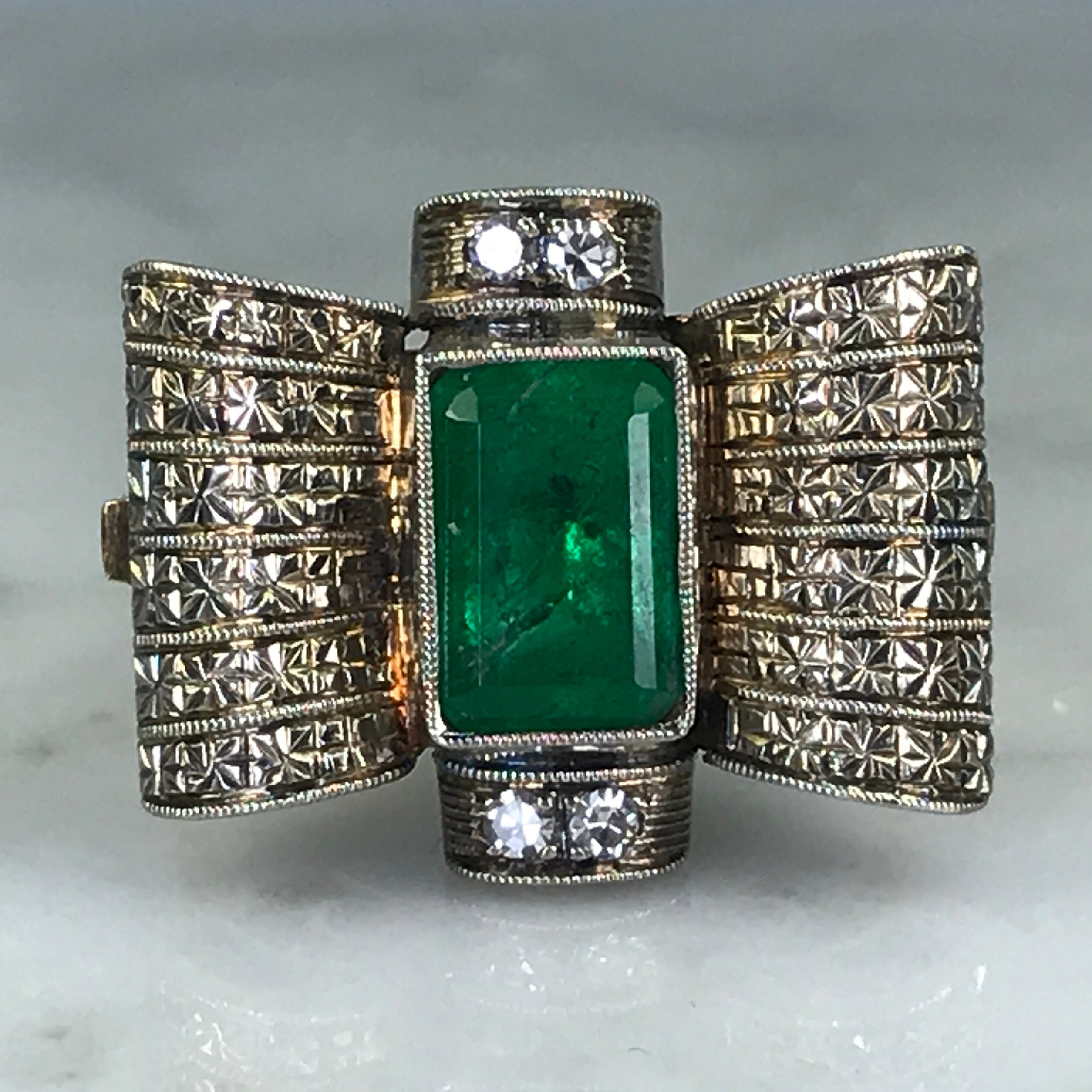 Emerald Diamond Ring 18k Gold Bow Tie Design Unique